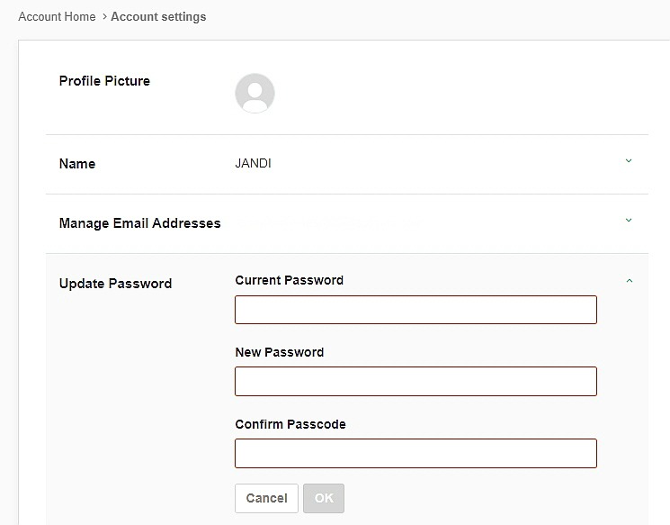 3. Under [Update Password], type in your current password and a new password. Then click [Okay] to save your changes.
