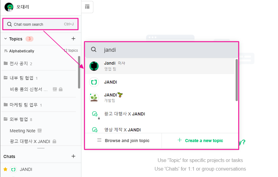 To use Jump, select the Jump button on the upper left corner of your JANDI screen, or use the keyboard shortcut Ctrl + J (Mac: Cmd + J).