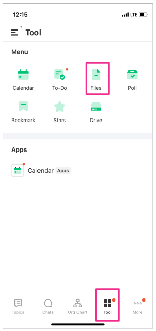 <Mobile> 1. Select the file icon located on the upper right corner in a Topic, or go to the [Tool] tab and select [Files] to view the list of files uploaded in JANDI.