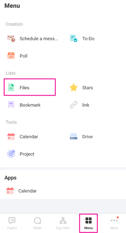 1. Select the file icon located on the upper right corner in a Topic, or go to the [Tool] tab and select [Files] to view the list of files uploaded in JANDI.