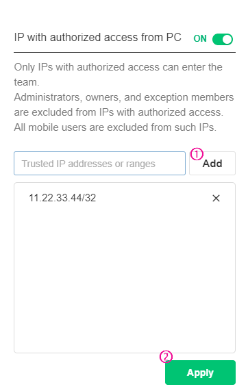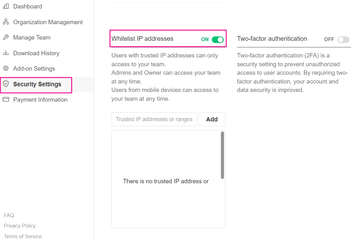 1. Go to [Team Admin]-[Security Settings]-[Whitelist IP addresses] menu and turn ON the feature.