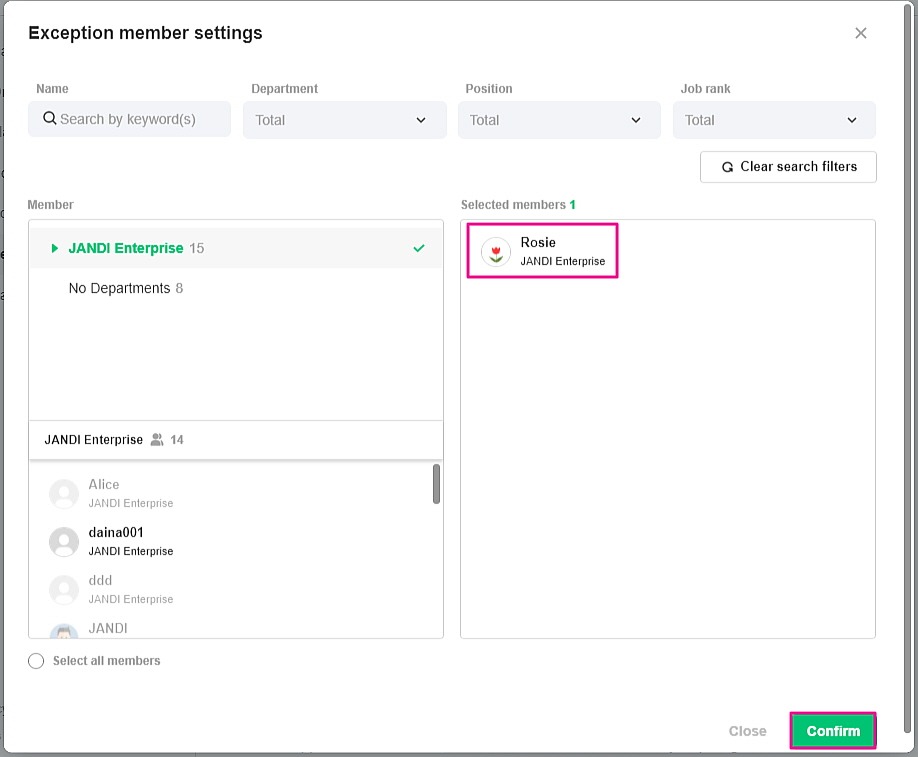 4. Once you click the add icon, you can choose members from the organization chart. Select the member.