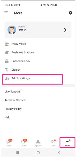 On your mobile, select the [More] tab on the bottom. [Admin Menu]