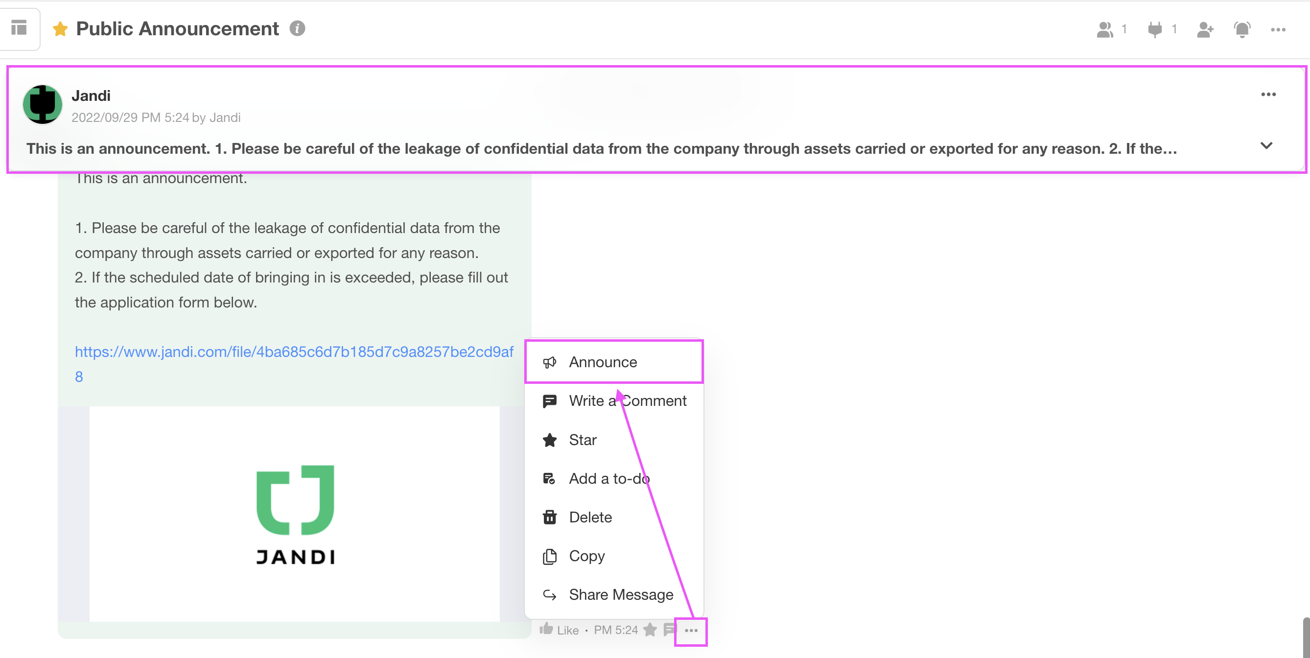 You will see the [...] icon to the right side of the message. Click the [...] icon and select [Announce]