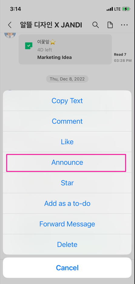 3. Once the message has been announced, you will see the message fixed on the top of the Topic for everyone to see.