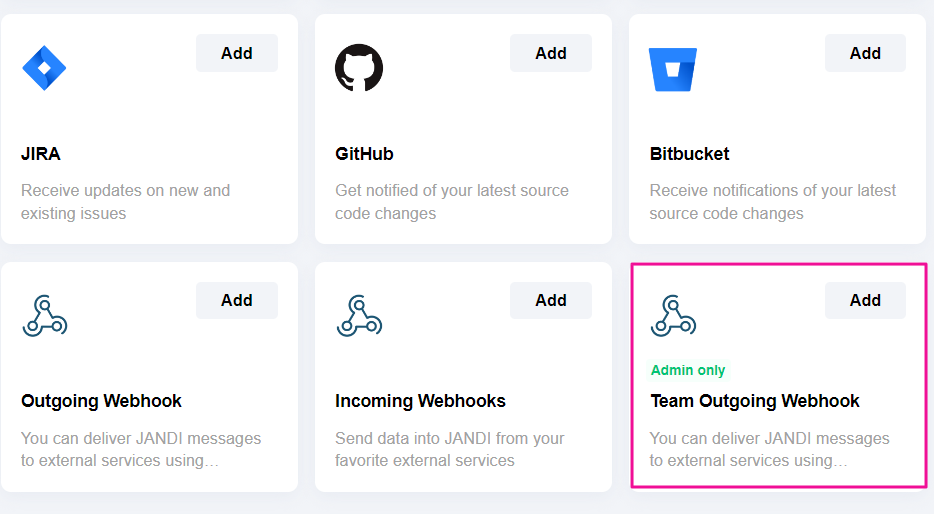 JANDI Connect Connect List -> Team Outgoing Webhook Select Add