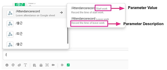 JANDI uses the outgoing webhook in the form of /command parameter and assists members in utilizing the webhook by entering a description and parameter example. Each member can write webhook messages and receive notifications through JANDI (Conversation with Me).