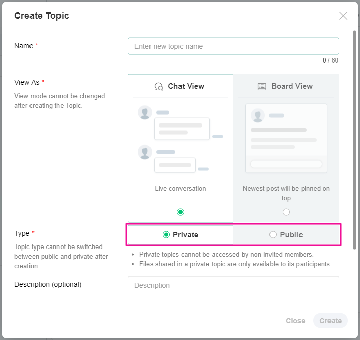 All files and messages shared on Private Topic will be accessible by the participating members only.(However, once a file in a private Topic has been shared to another topic, the file will be accessible to other members and lose its private status.)