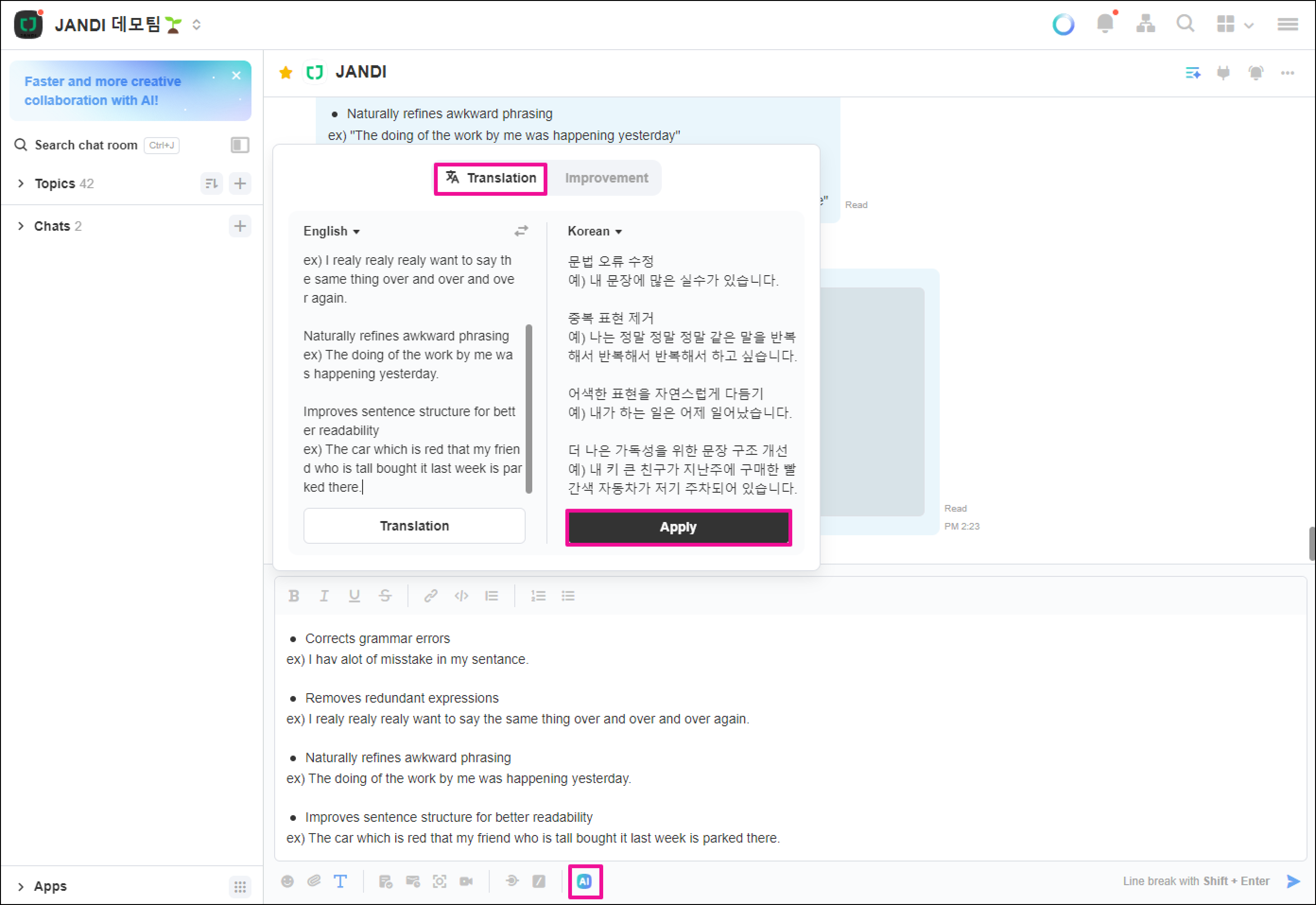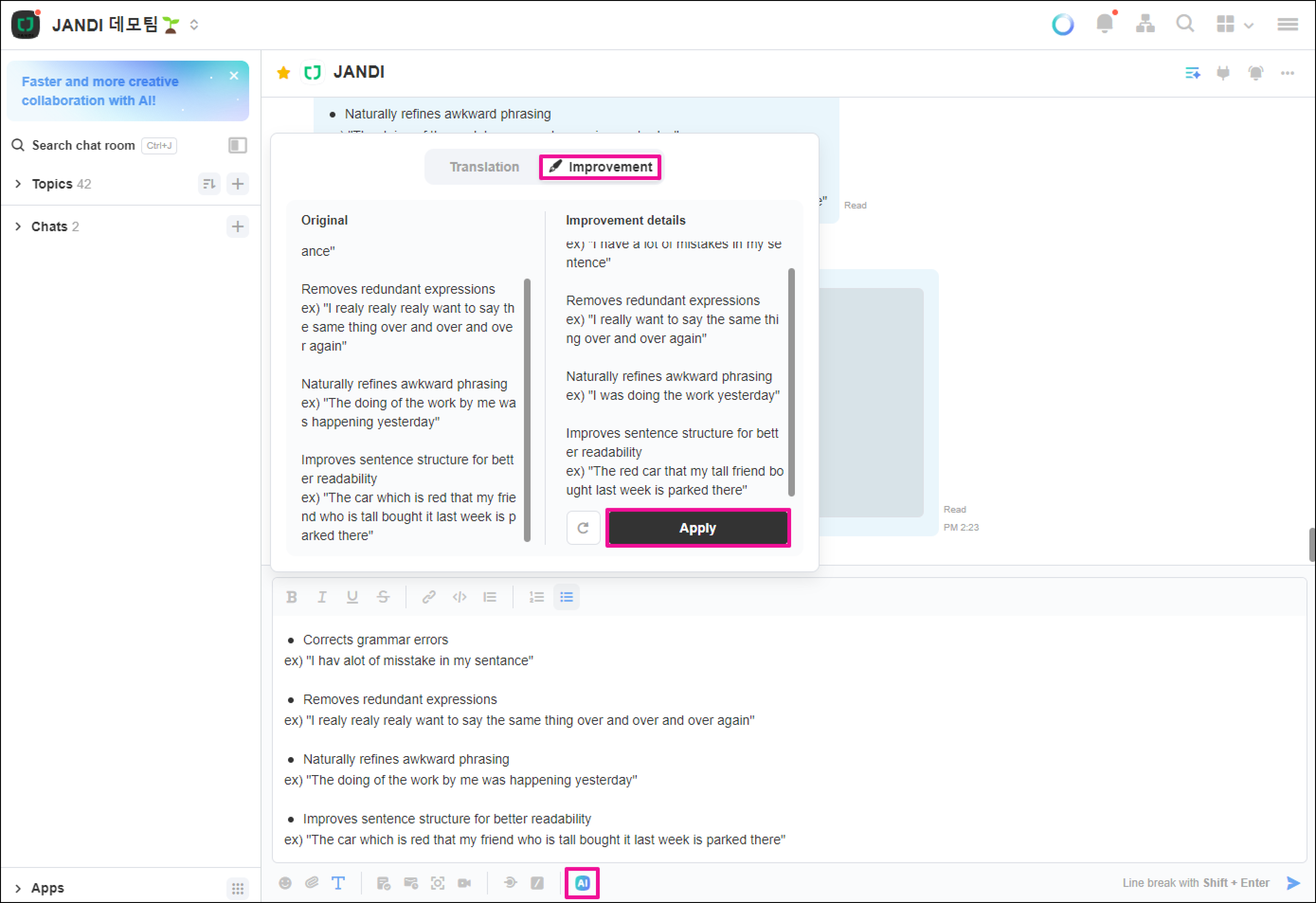 How to use the Messaging Assistant - Sentence Improvement: After entering your message, click the [AI] button below the message input box > Select [Sentence Improvement] > Click [Apply] > The message you wrote will be replaced with the improved version.