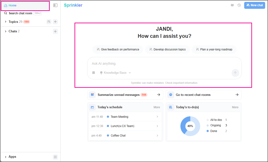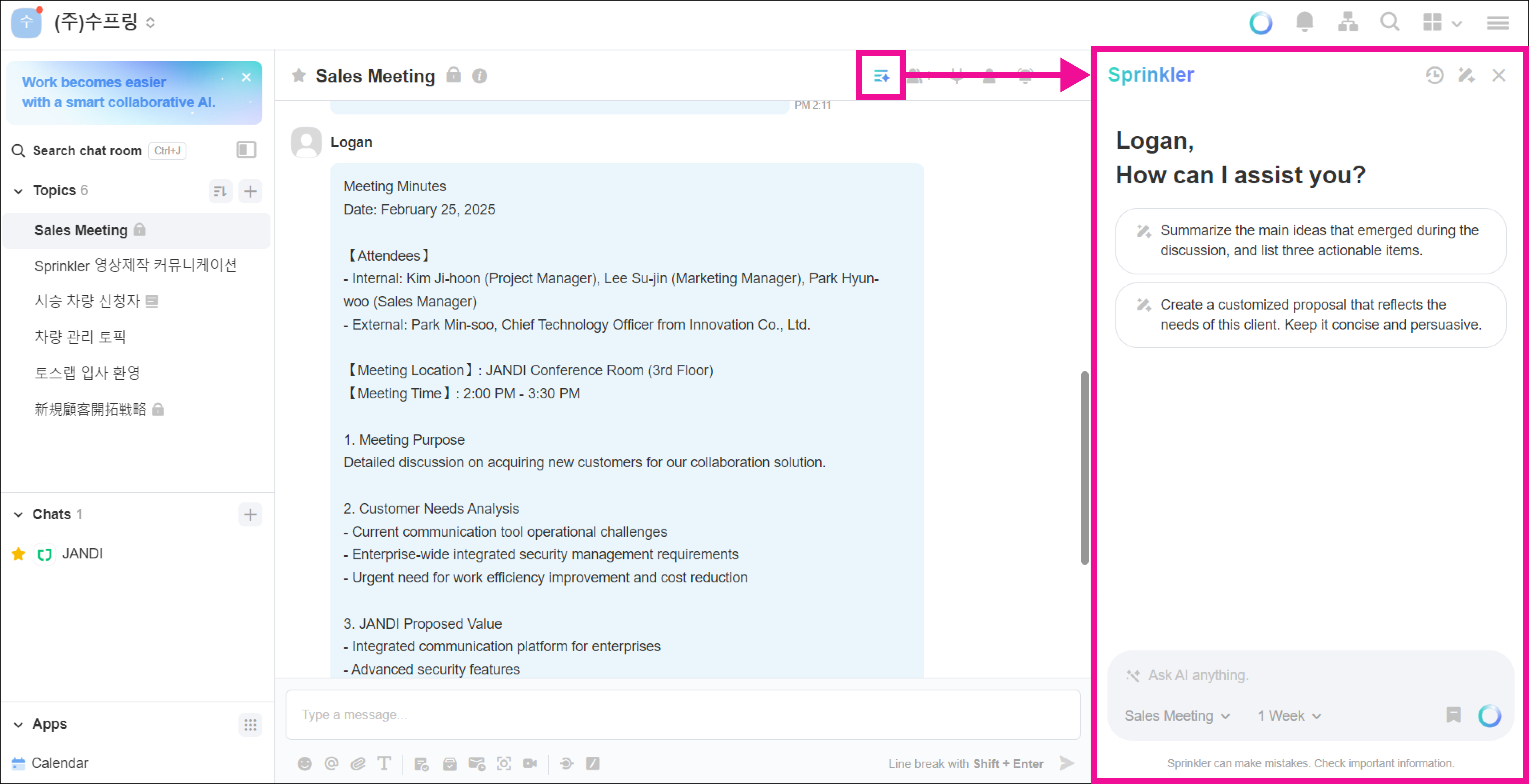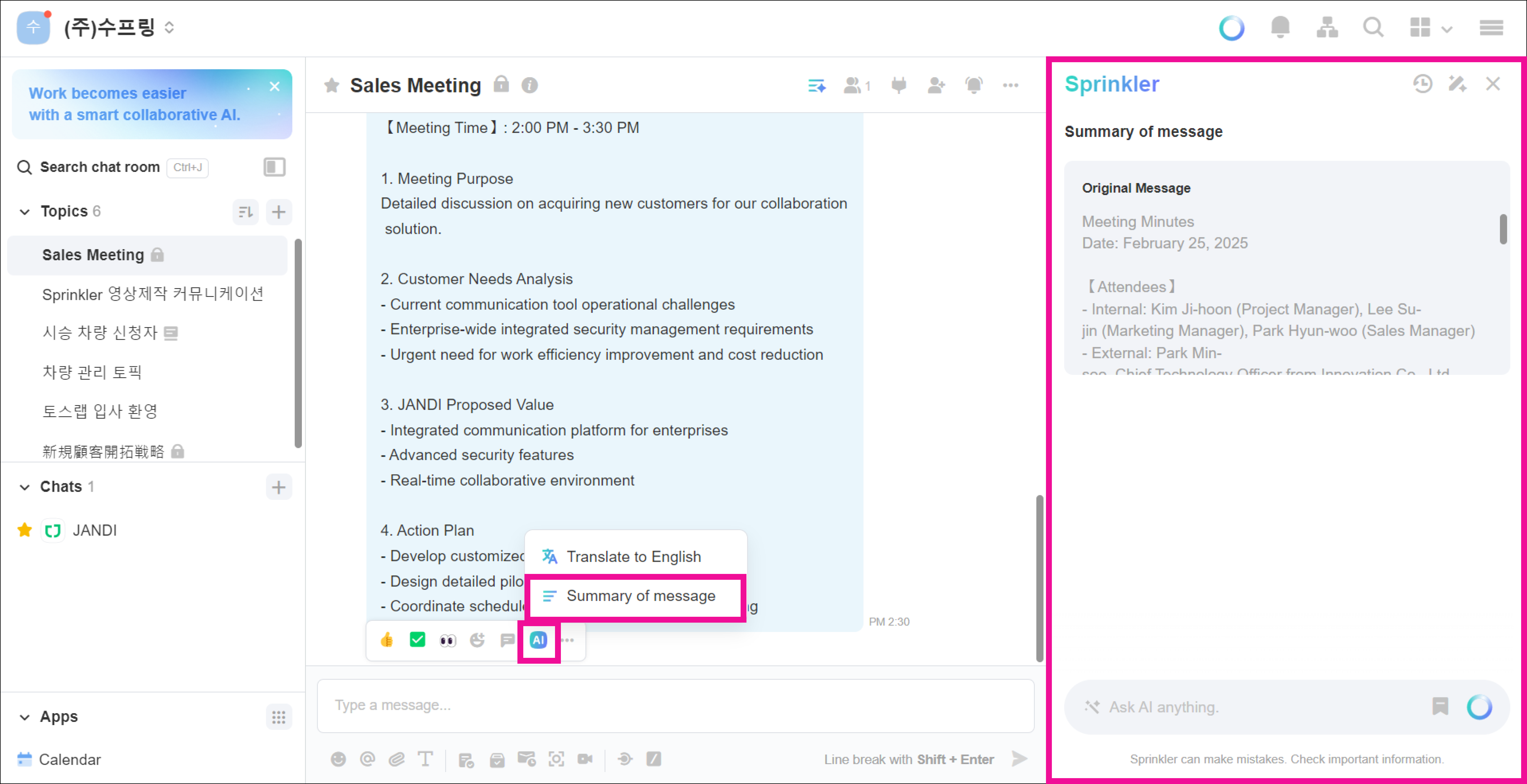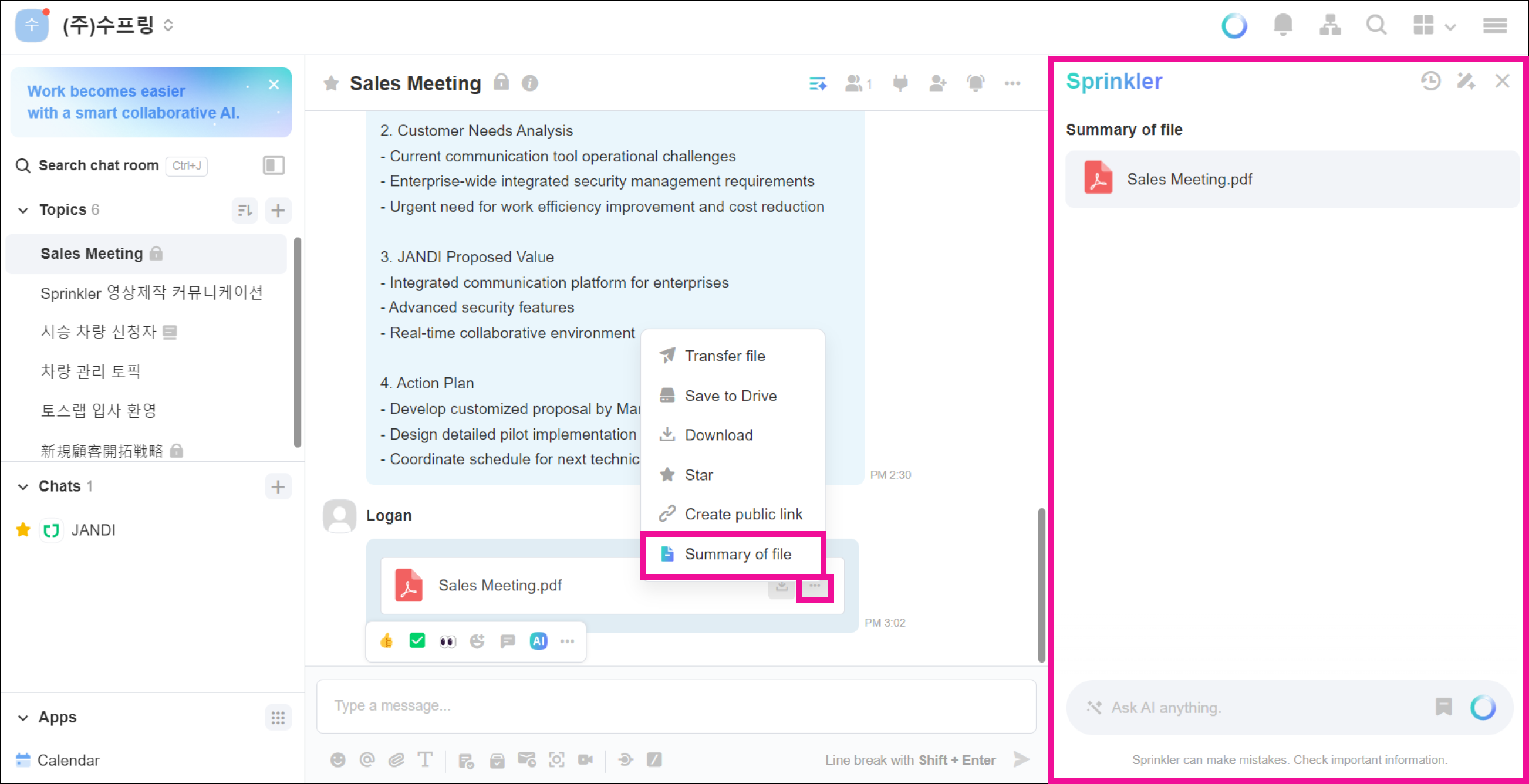 Sprinkler is JANDI's AI (artificial intelligence) function. You can summarize the context of messages and files uploaded within the chat room or ask AI questions and get answers.