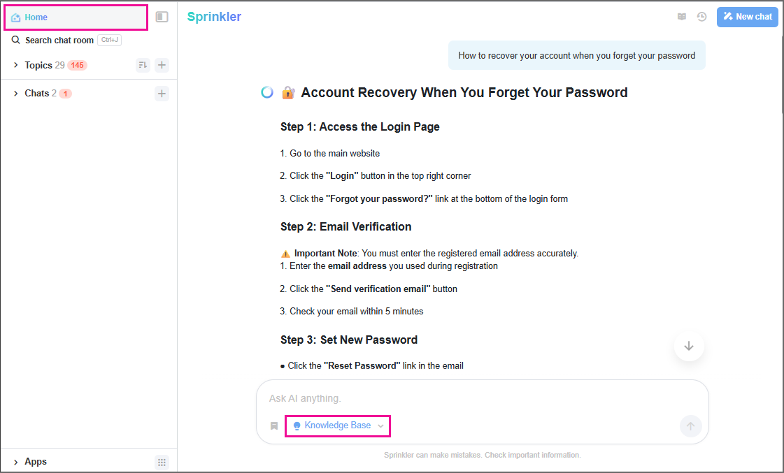 How to use the Knowledge Base: Click [Home] in the top left > Click [Knowledge Base] > Enter your question > Press Enter