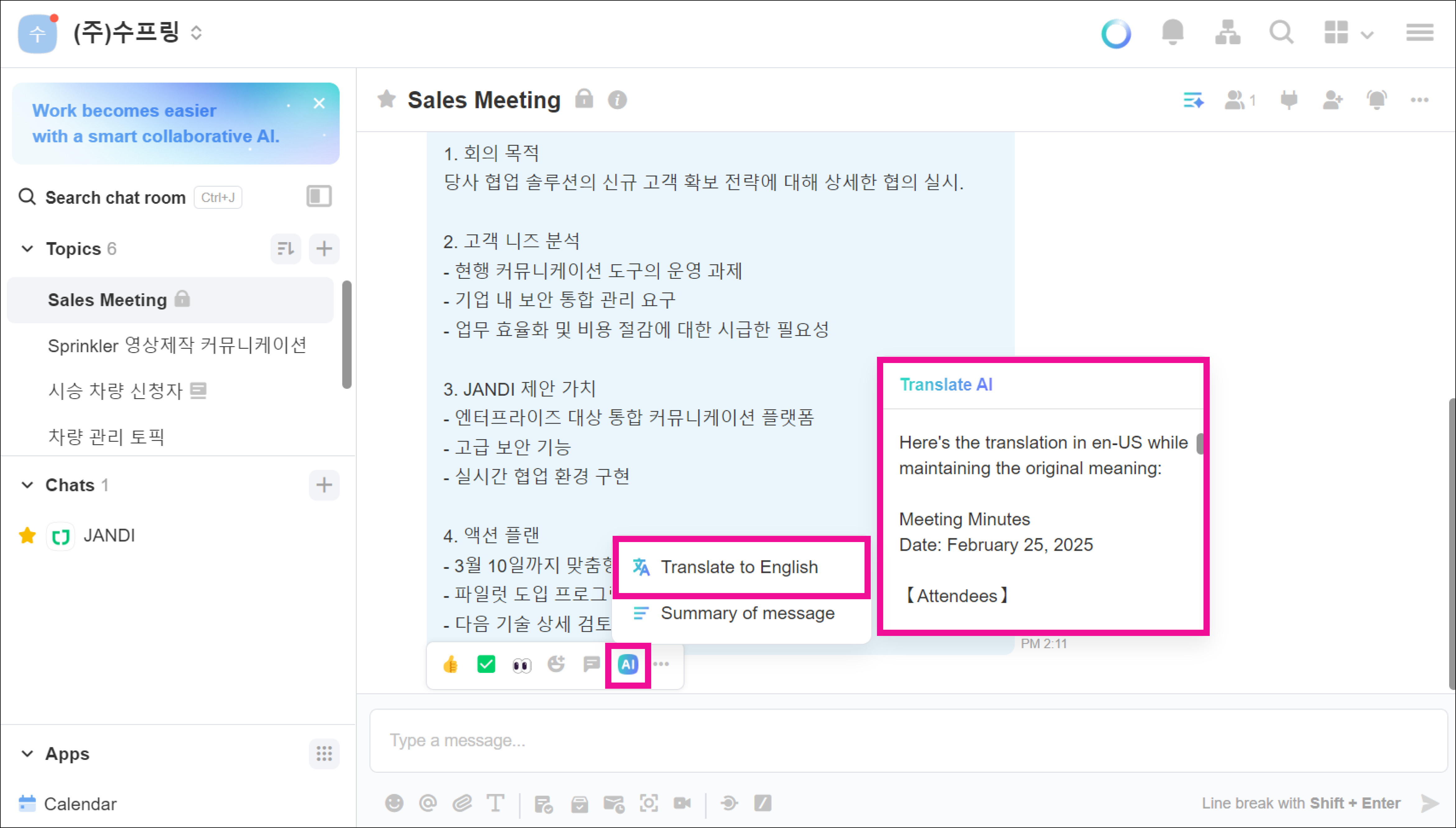 JANDI supports six languages: Korean, English, Japanese, Simplified Chinese, Traditional Chinese, and Vietnamese, and Sprinkler can translate over 100 languages.