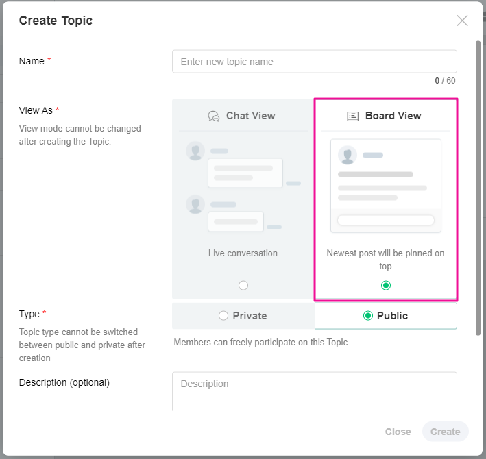 4. Select the view mode as [Board View] and choose the type of topic, which is either public or private.