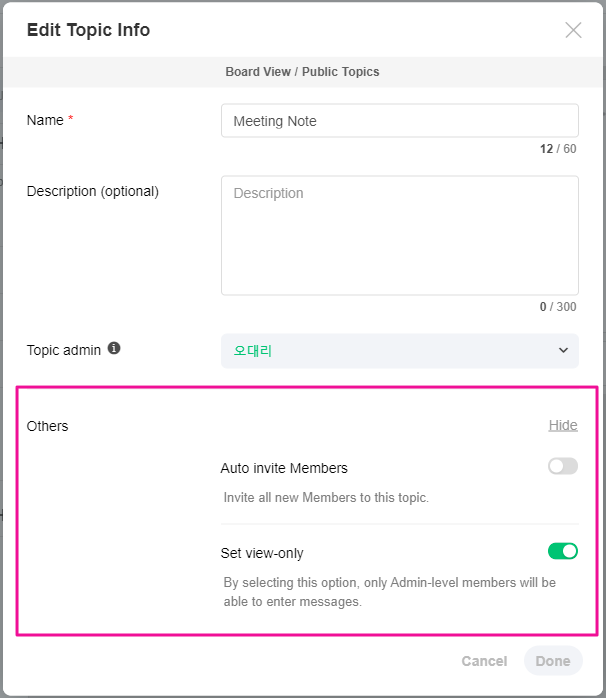 *Once your Team Admin has turned off the Board & Notifications feature, the existing Board View Topic will be switched to a read-only topic, and notification for the Board View Topic will be disabled.