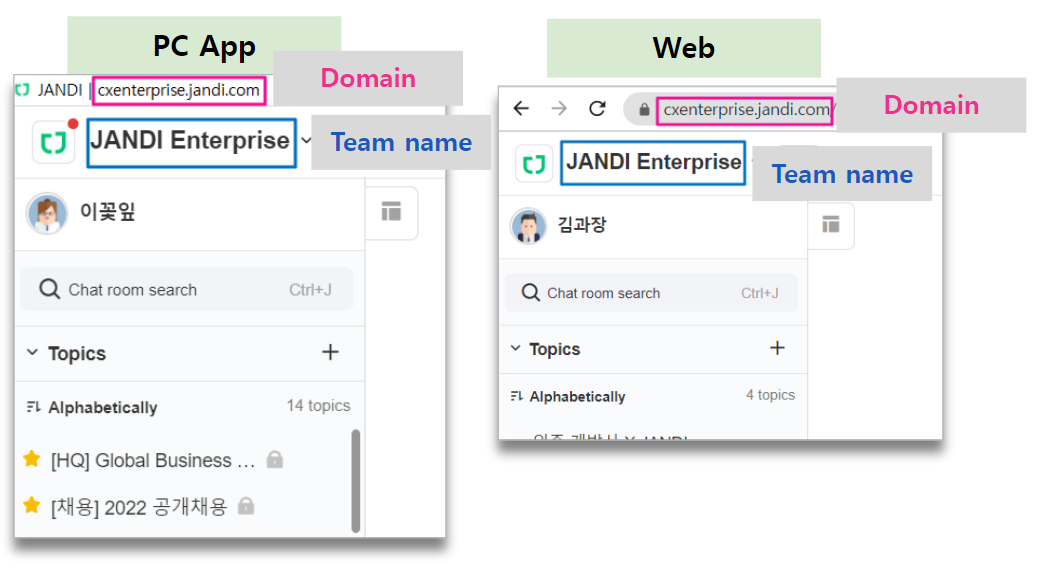 1. On the web, look at your web browser’s address bar. You can also see the team domain on the top part of your PC JANDI app.