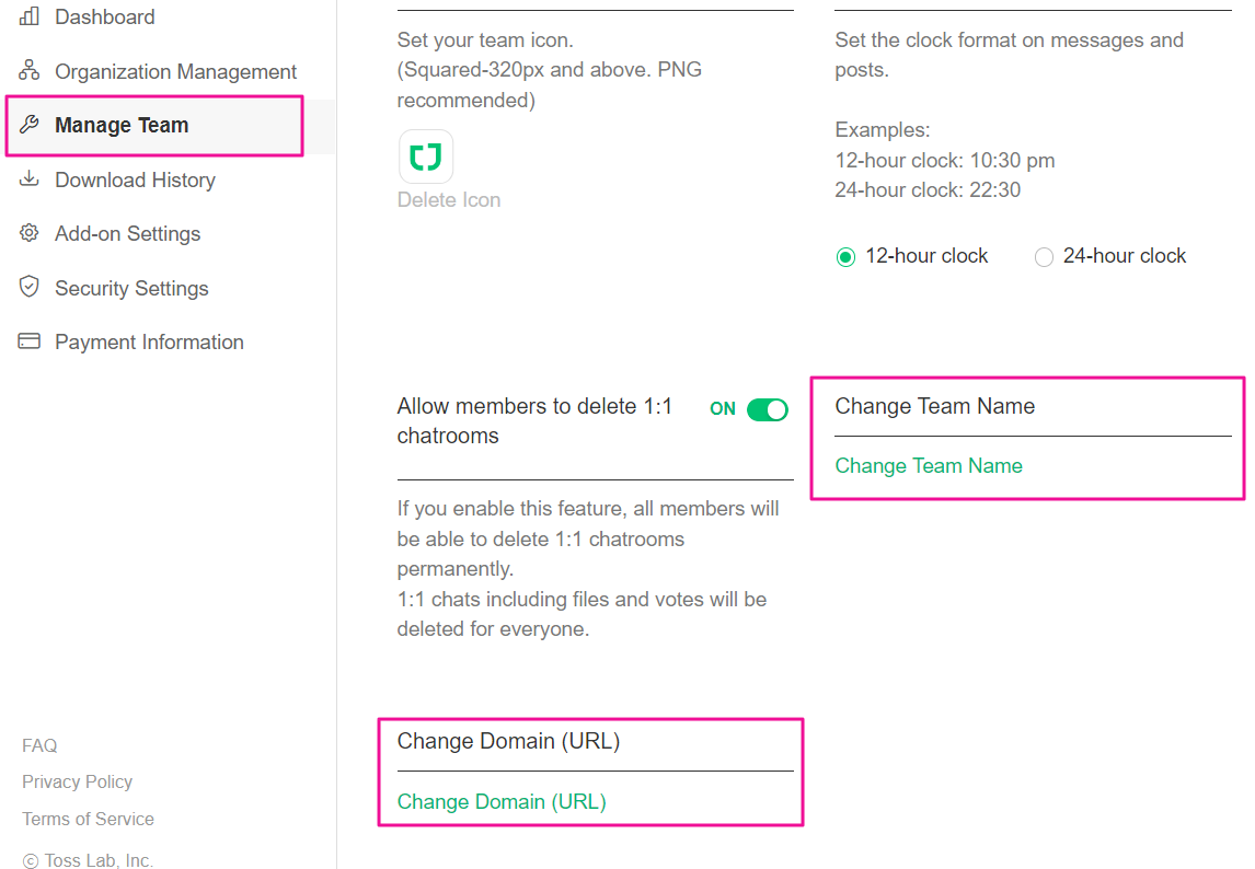 On the [Manage Team] tab, you can change the Team name and domain, or delete the team.