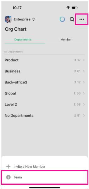 *On your mobile app, go to the [Org chart] tab on the bottom. Select the (...) icon and select [team] to view the Team name and domain.