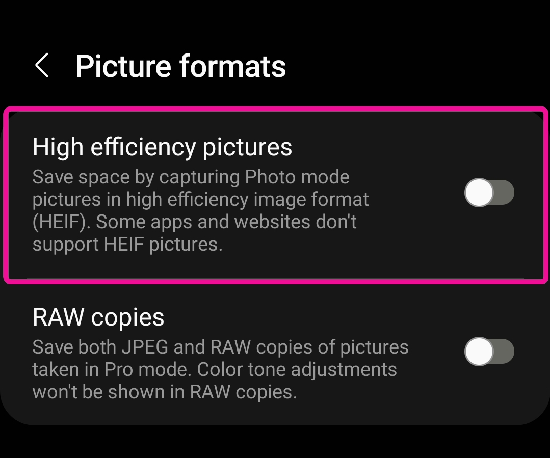 If “High efficiency photo” is ON in camera settings, images are saved as HEIF and can be found in [Files] instead of [Photos].