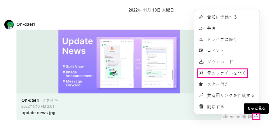 1. メッセージをマウスで指す時見える[...]もっと見るボタンをクリックし [元のファイルを開く] を選択してください。