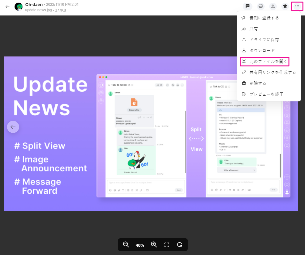イメージプレビュの右上にある [...] もっと見る > [元のファイルを開く] の方法でも可能です。