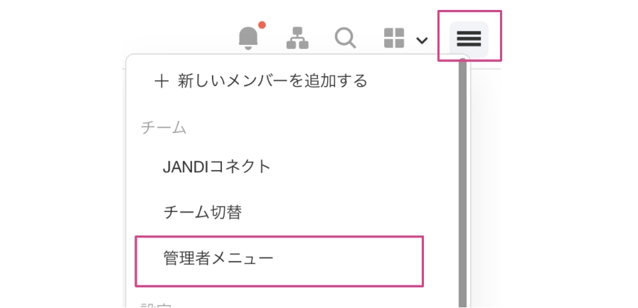 - JANDI PC画面上段の [=] メニュー - [管理者メニュー] - [決済情報] 順で選択してください。
