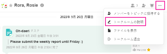 <PC/Web> 1.トークルーム画面右上の[V] - [チャットルームの説明文]メニューをクリックします。