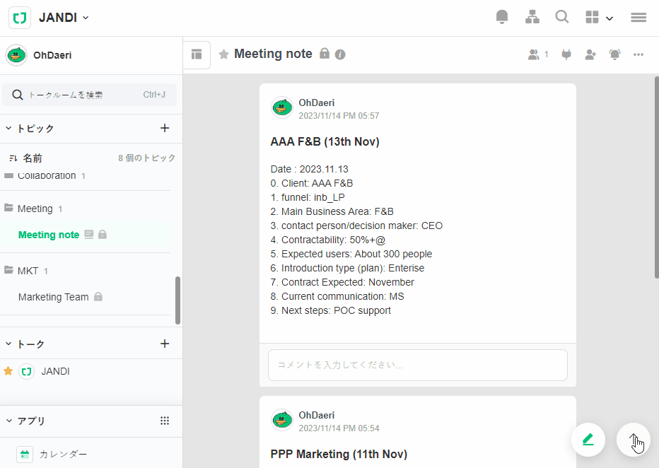 すでに通知が来ているトピックに入るためには、Ctrl(Cmd) + Jを押した後、キーボードの方向キーで選択し、Enterキーを押すとすぐにトピックに入り、メッセージを入力することができます。