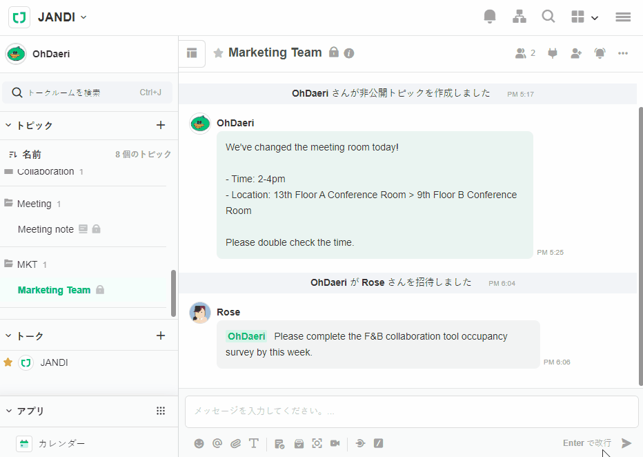すでに通知が来ているトピックに入るためには、Ctrl(Cmd) + Jを押した後、キーボードの方向キーで選択し、Enterキーを押すとすぐにトピックに入り、メッセージを入力することができます。