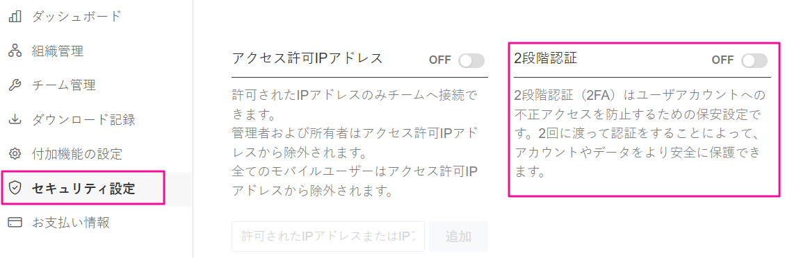 管理者メニューでチームに2段階認証を適用でき、2段階認証を設定したメンバーのみチームへのアクセスが可能です。(Enterpriseプランで適用可能)