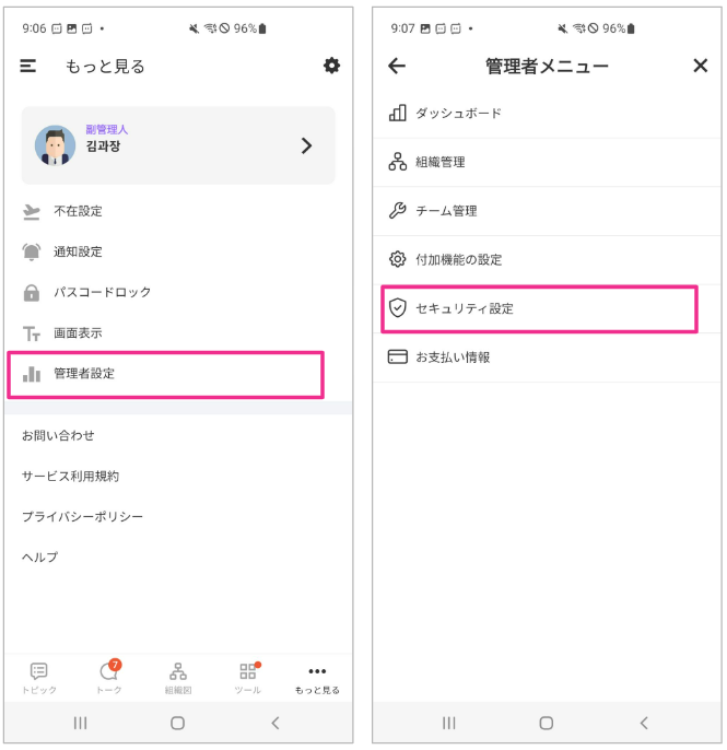 1. アプリ右下の[...]もっと見る > [管理者設定] > [保安設定]順に選択してください。