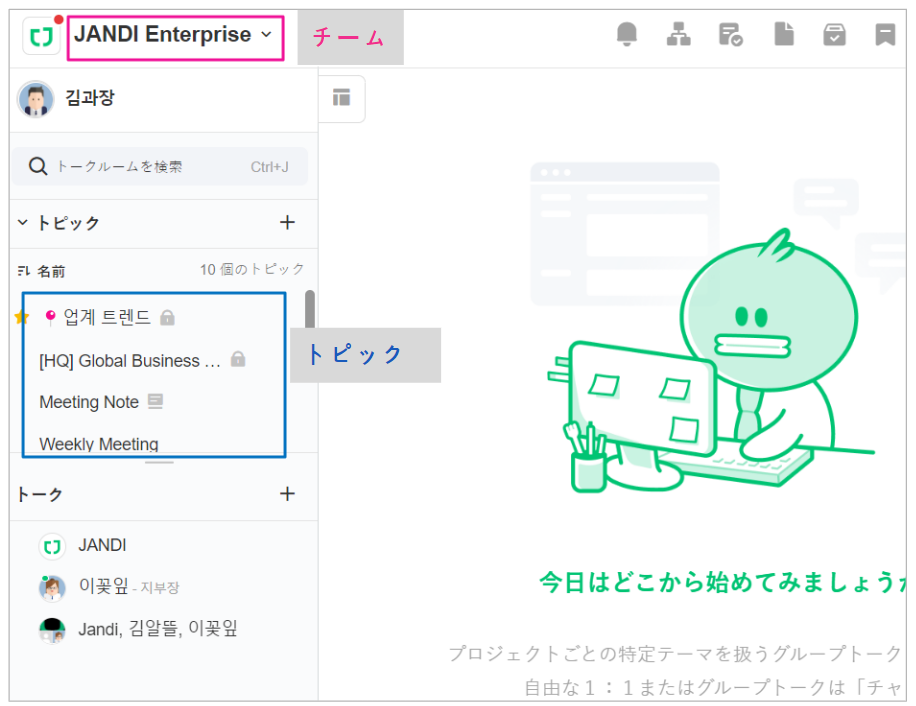 ’チーム’は一緒に協業する会社または団体です。’トピック’はチームの中でメンバー達が参加する主題別トークルームです。 1つのチームの中で部署別、関心事別など様々な主題に合うトピックを誰でも自由に作って参加できます。