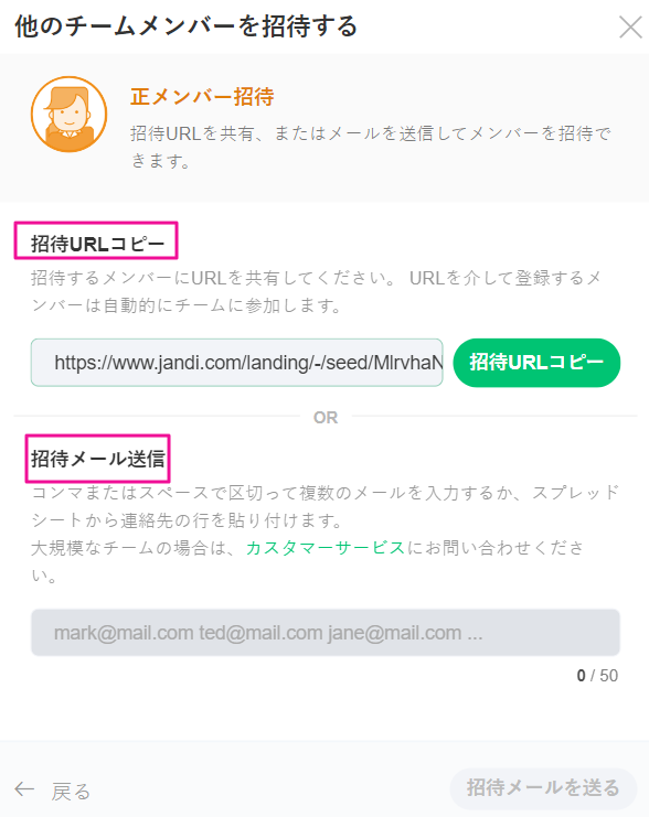 cf) 100名以上のメンバー達を一括でチームに招待したい場合にはJANDIチームsupport@tosslab.comよりご連絡ください。