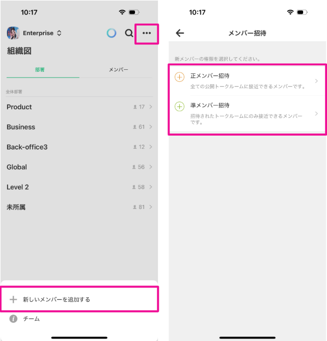 JANDIアプリの[チーム]タブ右上にある[...]> [新しいメンバーを追加する]ボタンをタッチし正会員/準会員権限を選択しメンバーを招待してください。