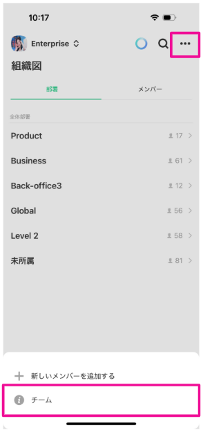 [チーム]タブ上段、 ( ...) ボタンをタッチすると表示される[チーム情報]画面でURLアドレスを確認します。
