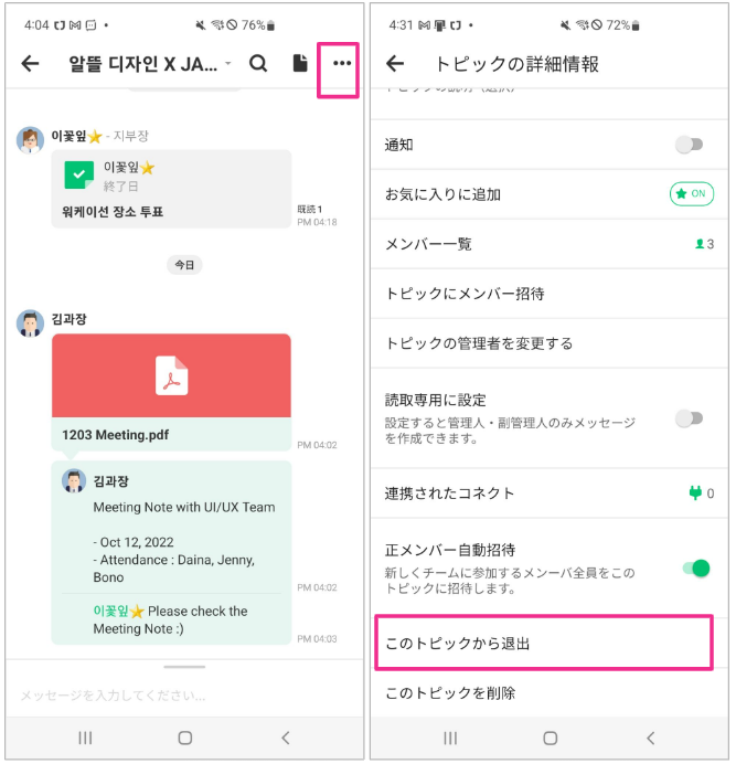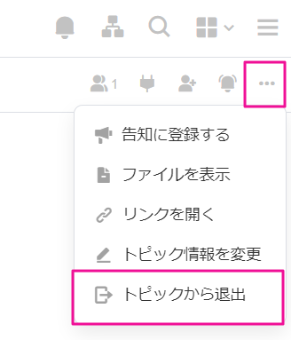 <PC/Web> トピックトークルーム右上もっと見る[✓]ー[トピックから退出]ボタンをクリックします。