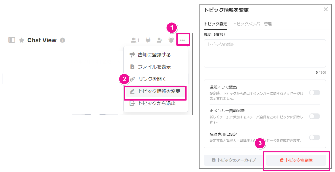 <PC/Web>トピック右上もっと見る [...] → [トピック情報を変更] →[トピック削除] メニューをクリックします。<Mobile> トピック右上の[≡]をタッチすると表示される’トピック詳細情報’ウィンドウで最下段の[削除]ボタンをタッチします。