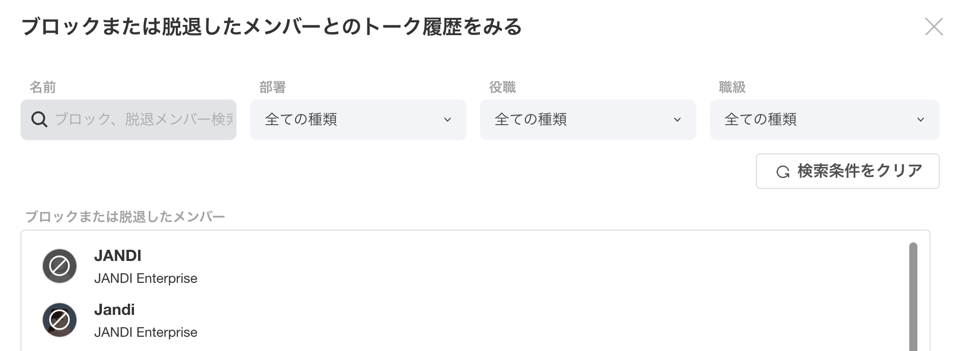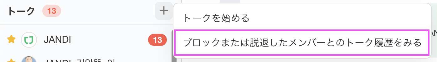 1.JANDIウィンドウ左下のトークリストで(+) - [ブロックまたは脱退したメンバーとの過去のトークを見る]をクリックしてください。