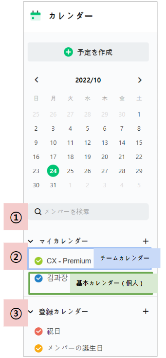 ③登録カレンダー:国/地域の設定により祝日とメンバーが設定した誕生日を確認できます。