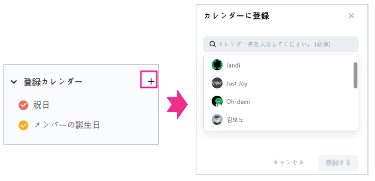 - 登録カレンダー + を選択し、登録したいメンバーを検索後、登録するとカレンダーに表示されます。