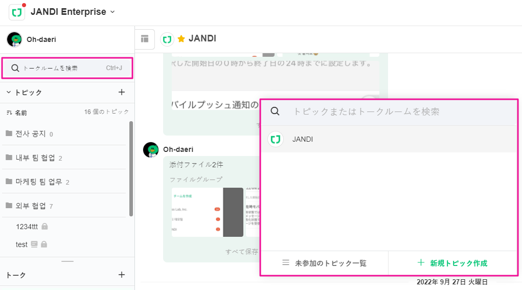 <基本JUMPに表示されるトークルーム> 新しいメッセージがあるトークルームまたは最近訪問したトピック3つを先に表示 <検索語が入力された場合表示されるトークルーム> ー該当検索語が含まれたメンバーとの 1:1 またはグループトーク ー該当検索語が含まれた参加したトピック ー該当検索語が含まれた参加してないトピック ーもし検索語と一致する結果が1つもない場合には該当検索語ですぐ新しいトピックを作成できます。