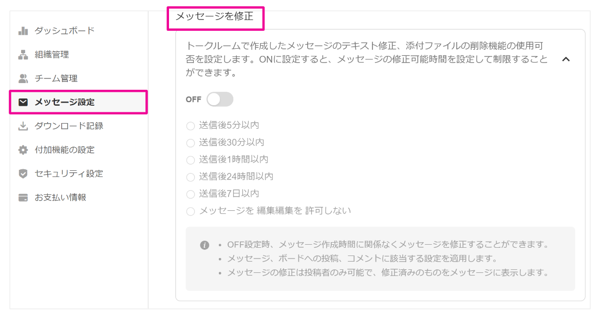 メッセージ編集機能時間を設定し、指定期間以降はメッセージを修正できないように制限することができます。