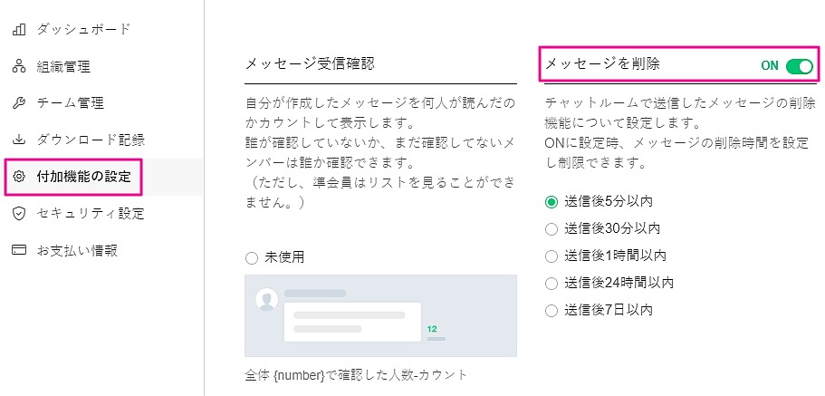 作成後5分/30分/1時間/24時間/7日以内などの削除可能時間を設定してください。