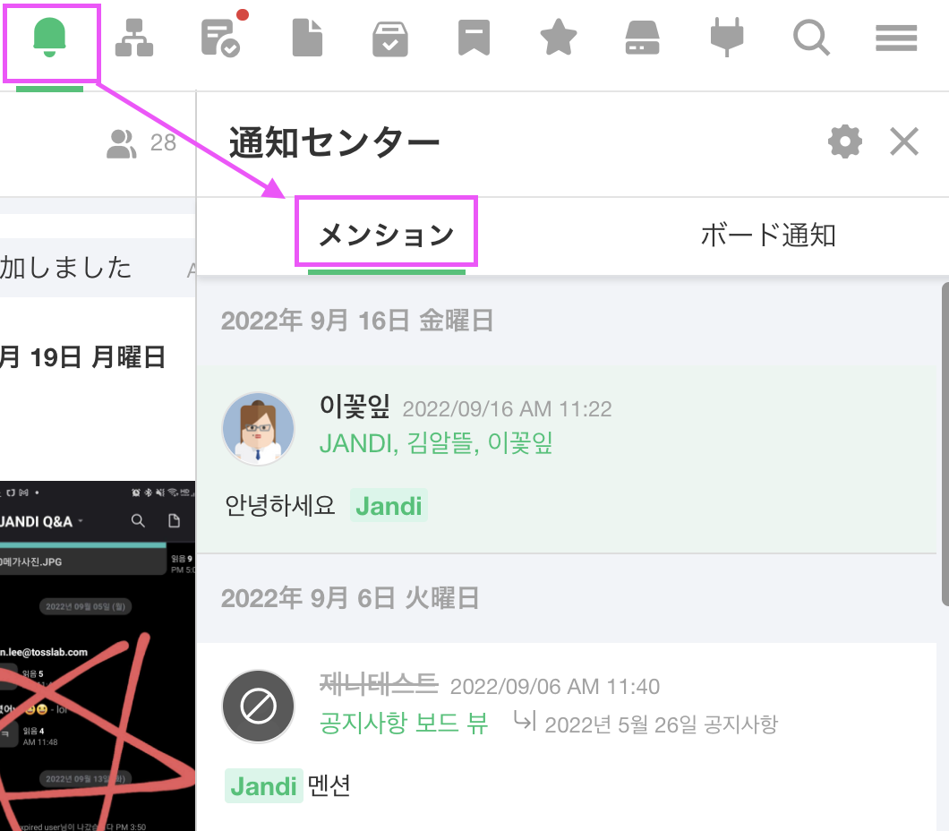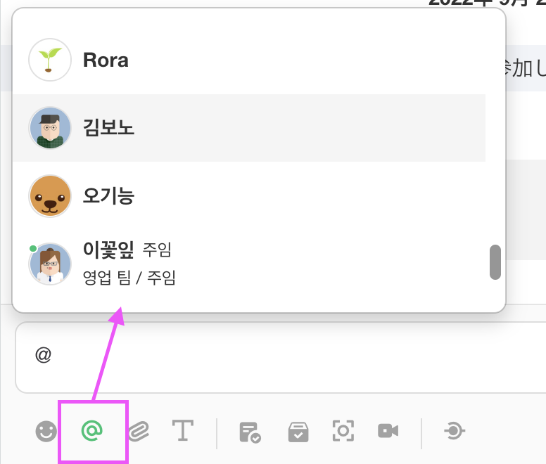 *メンション(mention)はメッセージに特定メンバーを指名する機能です。メンション機能でチーム員に業務を速く伝え、伝えられた業務を管理して見ましょう!