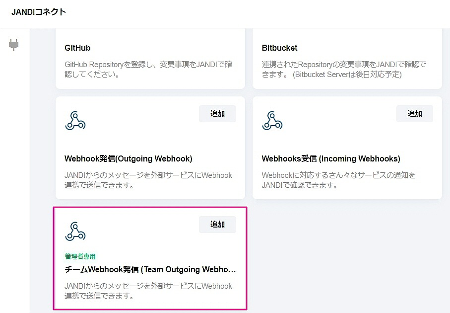 JANDIの右上ツールメニュー → JANDIコネクト コネクトリスト→Team Outgoing Webhook を選択 連携するタブで設定できます。