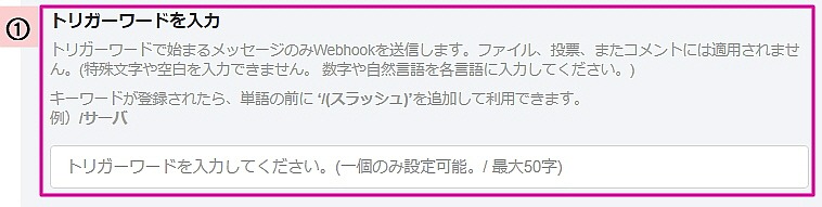 ①トリガーのキーワードを入力:/command コマンドを定義します。コマンドは空白無しで最大50字まで作成できます。