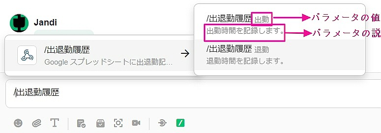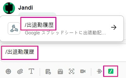 「出退勤履歴」をキーワードとして入力した場合、実際メッセージ入力欄には以下のように見えます。 入力欄に直接'/'や、[/]を選択し、入力したいキーワードを選択します。 コマンドリストでキーワードを選択しなかった場合、Webhookを設定したコマンドとして認識されないので、使用されるときはご注意ください!