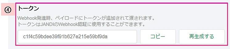 ④トークン:Webhook送信時、ペイロードに挿入されるトークンを確認できます。