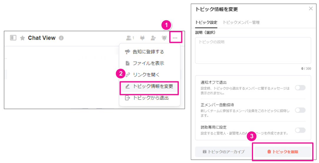トピック削除方法:トピックの右上にある[...]をクリック > [トピック情報を変更] >[トピック削除]