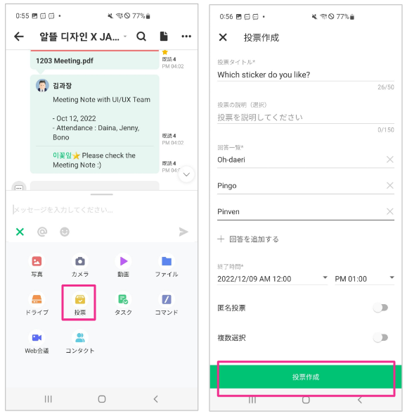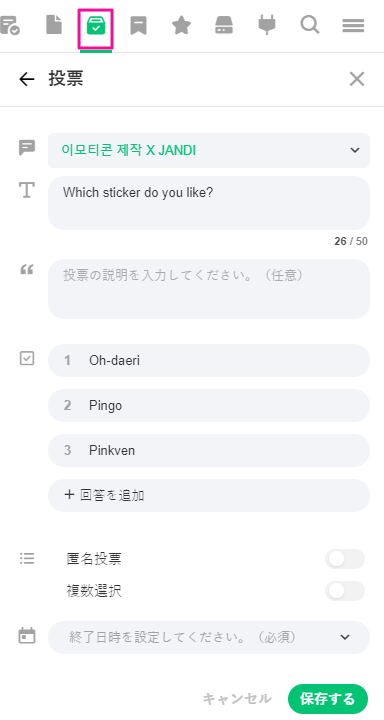2. [投票]アイコンを選択して投票のタイトル、選択肢リスト、締切時刻、共有トークルームなどを設定して投票を作成してください。