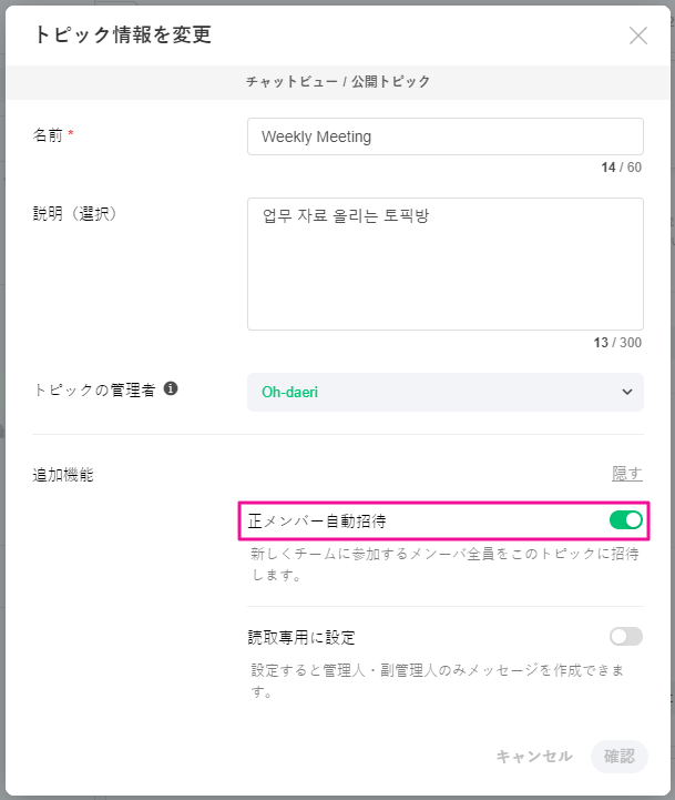 2.'トピック情報を変更'ウィンドウで[自動招待]可否を設定してください。